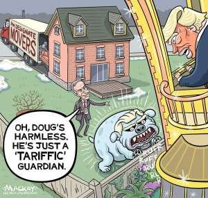 Mark Carney, the new Liberal leader and prime minister designate, confidently refers to a fierce pitbull labelled Doug Ford, symbolizing Ford’s role amid trade tensions, particularly against Trump’s proposed 50% tariffs on Canadian steel and aluminum. The cartoon reassures that “Doug’s harmless. He’s just a ‘tariffic’ guardian.” A moving truck marked “PM Designate Movers” hints at the transition of power, while Trump looks on from a golden balcony. After Ford’s initial threats to charge Americans for Ontario’s electricity, he wisely backed down, allowing for some diplomatic breathing room with U.S. Secretary of Commerce and FOX News host Howard Lutnick who met later in the week in D.C. to be effectively neutered. This cartoon highlights the ongoing political dynamics and trade tensions in Canada. One wonders if pitbull Doug will be unleashed in the near future.