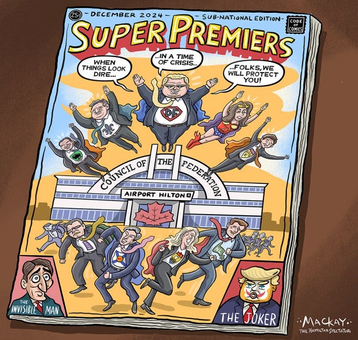 With the federal government mired in scandals and dysfunction, Canada’s provincial premiers seized the moment to assert themselves. A gathering of the Council of the Federation (which has a Super Friends Hall of Justice ring to it) showcased a growing trend: provincial leaders stepping into roles traditionally dominated by Ottawa. From energy policies to economic resilience, these so-called “super premiers” are taking the reins, crafting regional solutions to issues that demand a cohesive national response.
