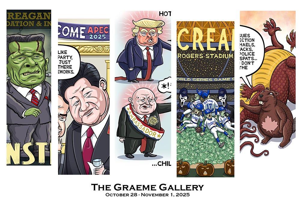 Welcome to what was World Series Week, a major event for many of us north of the U.S. border. The closer you are to Toronto, the more the excitement builds—just as it does around Los Angeles. For others, the Dodgers vs. Blue Jays might be as thrilling as watching, say, the Astros take on the Braves: not very. But for Canadians, it’s a big deal. Adding to the buzz is Donald Trump’s dramatic reaction to an Ontario ad using Ronald Reagan’s voice to warn against protectionism. Doug Ford’s government cleverly aired these ads during the World Series, targeting American Republicans and addressing local concerns over Ontario automakers moving to Illinois. Meanwhile, Trump and Carney were in Asia, trying to outmaneuver each other for the ear of the emerging Supreme Leader of Planet Earth (SLOPE), Xi Jinping. That’s where my editorial cartoons headed this week. Let’s dive in!