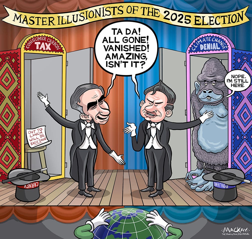 In Canada's 2025 election, Mark Carney and Pierre Poilievre act as political magicians. Carney's temporary tax break and Poilievre's climate denial, represented by a gorilla, are tricks that vanish once the election ends. Poilievre’s lack of a climate plan puts him behind, while Carney is ready to lead the conversation on sustainability. True leadership must tackle real issues once the illusions fade.